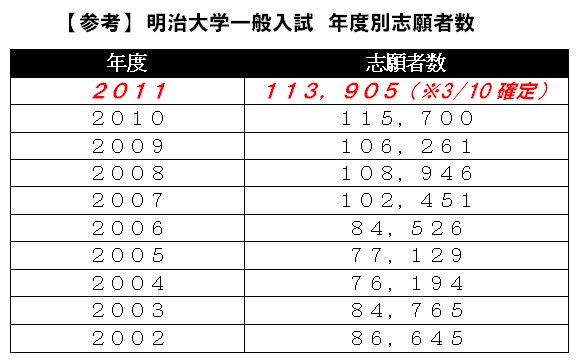 明治大学 明治大学の一般入試志願者数が11万3905人で確定 ~10万人超えは5年連続~ 2011.03.11 07:00 大学ニュース 入試関連 印刷する print 3月10日、明治大学の2011年度一般入試の志願者数が11万3905人と確定した。志願者数が10万人を超えるのは5年連続となる。 【速報】 明治大学 2011年度一般入試 志願者数11万3905人(確定) ~10万人超えは5年連続~▼本件に関する問い合わせ先 明治大学 広報課 担当: 西川 TEL: 03-3296-4082 添付資料 (クリックで拡大) close (クリックで拡大) close 印刷する print