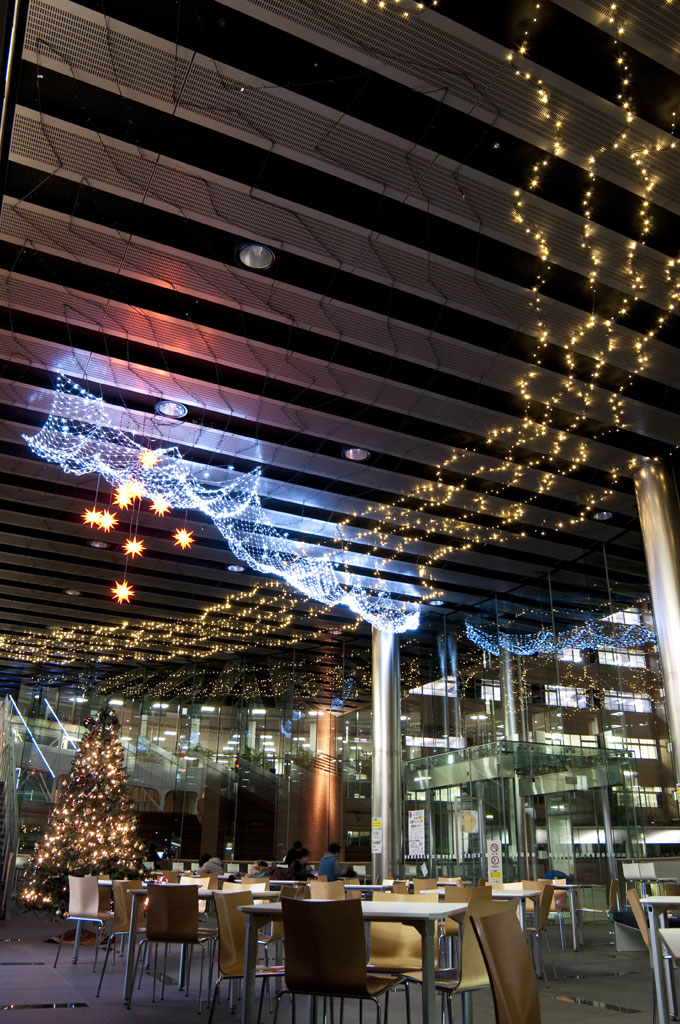 今年のWinter イルミネーションは、11月24日~2月下旬に実施。現在、メディアラウンジはプラネタリウムを思わせる満天の星空となり、外観には定番の巨大ツリーとともに、MELICへと続く木々にイルミネーションを灯し、“光り輝く図書館”に姿を変えている。