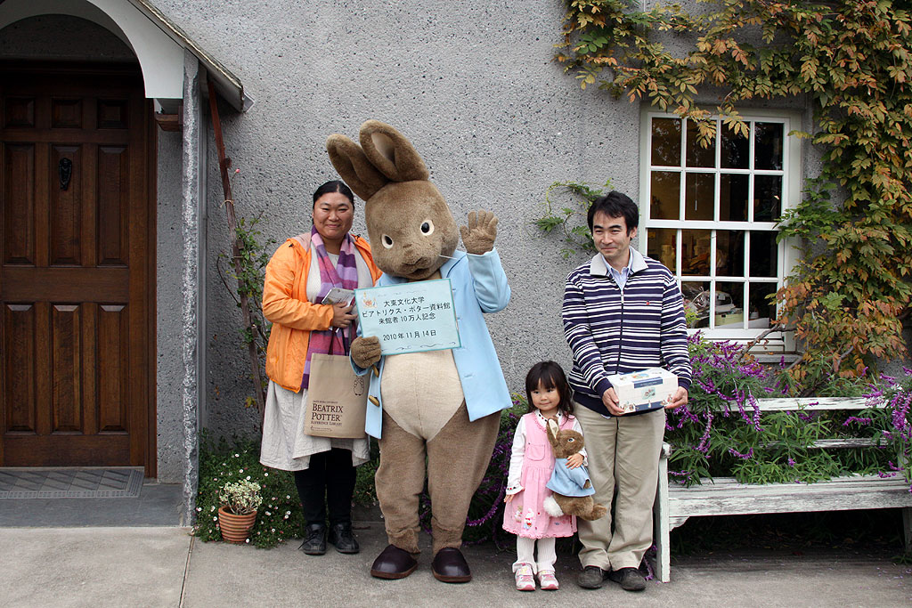 こうした中、同資料館は2010年11月14日の埼玉県民の日に、入場者が10万人を突破した。記念すべき10万人目に来場したのは、家族3人で訪れていた毛呂山町の緒方さん一家。資料館入口で記念品の「ピーターラビットの絵本全集」やぬいぐるみが贈られると、娘の紅美(こうみ)ちゃん(3歳)は驚いた様子だったが、記念写真を撮る際には笑顔を見せた。父親の隆二さんは、「紅美はピーターが大好きで、この資料館には開館以来、20回ほど訪れています。四季を通じて庭や菜園の美しさも楽しんでいます」と、資料館の魅力を語った。