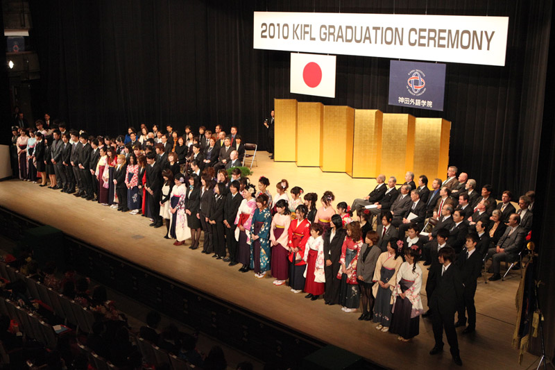神田外語学院の卒業式の司会進行、送辞、答辞は、全て英語で行われる。