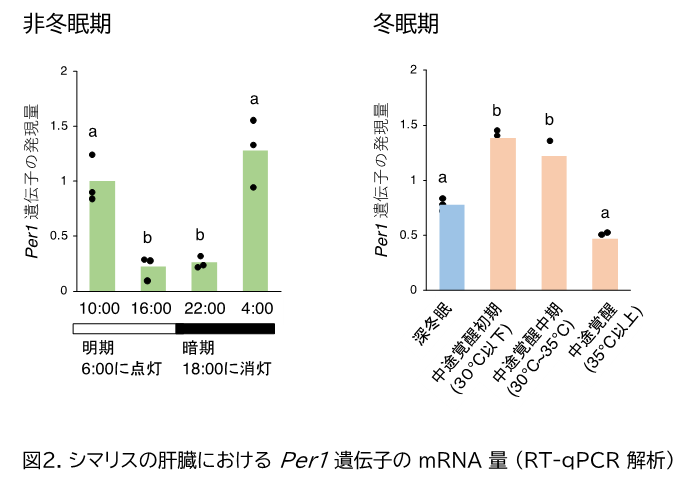 ・冬眠期のシマリスの肝臓において、時計遺伝子 Per1 が中途覚醒に伴って周期的に発現していることを明らかにした。