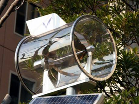 街路灯に使われている風力発電装置は、「ねじれ円弧翼型水平軸風車」という直径約40センチの風車が回転し、発電電圧を蓄電池に充電ができるタイプのもので、風車の外側を覆う円筒型の容器が風車の回転効率をさらにアップさせている。街路灯にはソーラーパネルも設置されており、“全天候型”の充電が可能。現在、明大のほか、静岡県浜松市の遊園地「浜名湖パルパル」など、全国数カ所に設置されている。