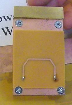 折り曲げたマイクロストリップ線路を電力供給線に対して平行を保ってずらせる限り電力供給線のどの場所でもLEDが点燈することがポイント。両線路は互いに接触しないよう、絶縁体を介して分離されている。