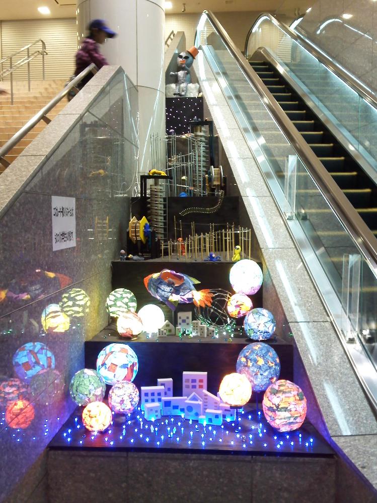 同大建設技能工芸学科の学生は、昨年に引き続き、JR高崎線熊谷駅のティアラ口のエスカレーター脇にイルミネーションを製作・設置。歩行者や駅利用者の心を和ませ、地元住民からも好評を博している。
