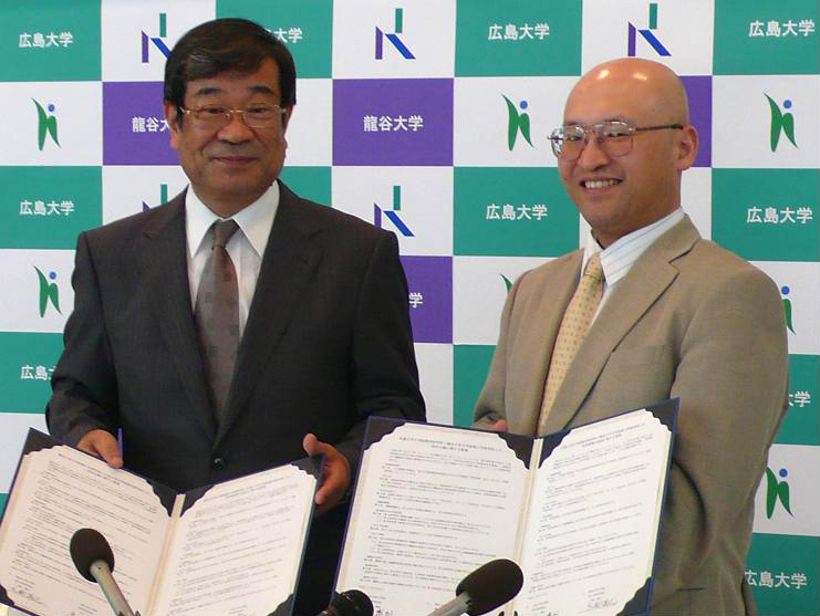 広島大学と龍谷大学との大学間交流に関する包括協定は、昨年度、広島大学と明治大学および龍谷大学と明治大学が同様の協定を締結しており、3大学の協力体制のもとで教育・研究活動における包括的な交流と連携を促進し、新たな研究領域の確立と学際的教育を展開させ、教育・研究の一層の進展に資することを目的とするものである。