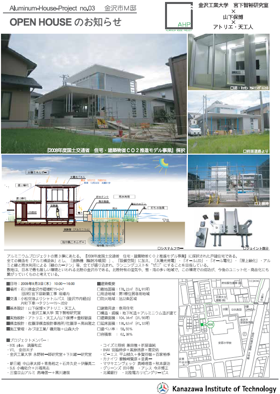 本プロジェクトでは、産学連携の実践的な試みとして「北陸の主要産業の一つであるアルミという素材の有利点を活かす」ことを主軸として、施工、運用・維持管理、再生・再使用といったライフサイクルにおいてトータルな省CO2環境共生型住宅の開発を目的としている。