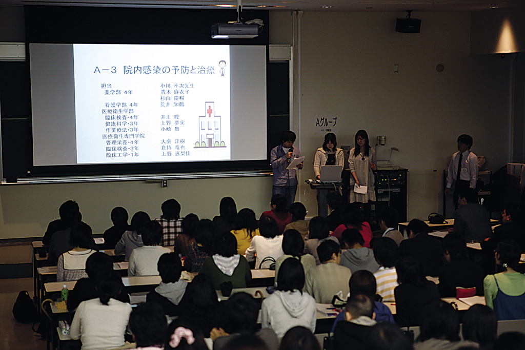 こうした特性を最大限に生かし、北里大学では学部間および学部・病院間の教育連携による「チーム医療教育」プログラムを平成18年度より開設。学生に、他職種の知識・技術、患者接遇を理解させ、職種間の相互理解と連携、協働できる能力や患者を総合的にケアする能力を身につけさせる試みを展開している。