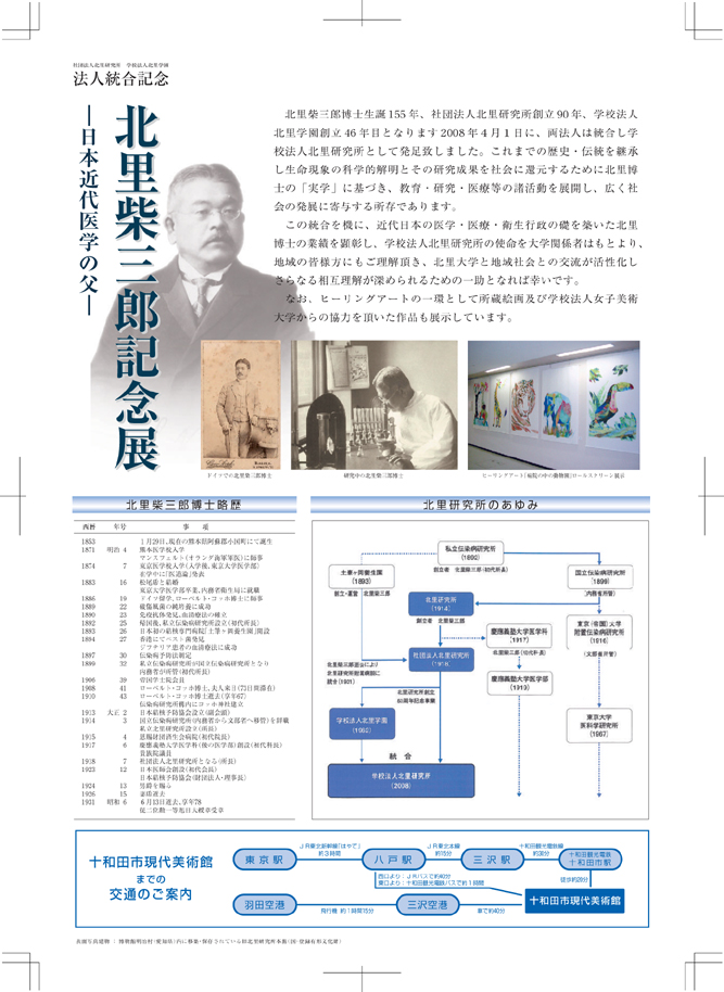 2008年4月1日、社団法人北里研究所と学校法人北里学園の法人統合により、学校法人北里研究所が発足した。この法人統合を記念し、青森県十和田市現代美術館・企画展示室にて「北里柴三郎記念展 -北里が十和田にやって来た-」を開催する。
