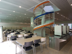 同じく地下1階の食堂は座席数521席を確保し、直上のマルチユースホールとはDNAをイメージしたらせん階段で結んだ。体育館は2階~4階の3層吹抜構造で、収納式のステージと座席設備を引き出すと座席数432席の講堂となる。遠隔講義システムも完備し、キャンパス間のみならず国内外の他大学を映像と音声で結ぶことが可能な設計とした。