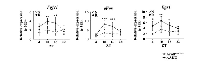 2において、脂肪細胞で体内時計の機能低下が起こることでインスリン感受性が⾼まることがわかりました。そこでインスリン感受性に関わるホルモン類を解析したところ、AAKOマウスの脂肪組織において、FGF21量が増加していることが明らかになりました(図3)。FGF21が細胞に作⽤すると、cFosやEgr1といった遺伝⼦の発現量が増加することが知られています。AAKOマウスの脂肪組織でもこれらの遺伝⼦発現量は増加しています(図3)。すなわちAAKOマウスでは、FGF21の量も活性も増加していることが⽰されました。