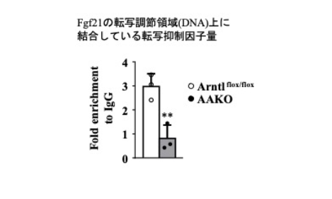 その結果、体内時計機能が正常に働いていると、Fgf21遺伝⼦の転写調節領域(DNA上にあるFgf21の転写を調節する領域)に転写抑制因⼦が結合しており、Fgf21の発現(mRNA量)を少なくしています。ところが体内時計機能が低下するとこの抑制因⼦が外れて、Fgf21の転写が活性化され、量が増加します。