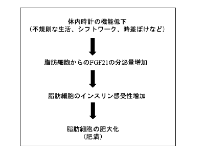 3. 体内時計の機能低下により肥満関連ホルモンFGF21(エフジーエフ21)量が脂肪細胞で増加する