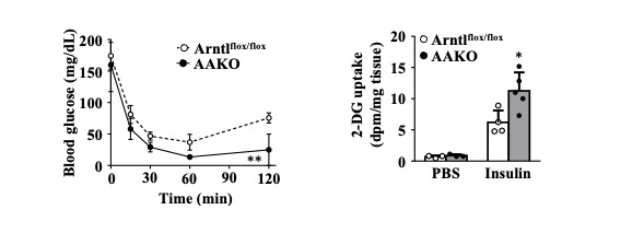 脂肪細胞は、膵臓から分泌されるインスリンの働きにより⾎液からグルコースを取り込み、細胞内で脂肪に変換(代謝)して蓄積します。すなわち、インスリン量やインスリンの効き⽅が良いとより脂肪を溜めこみ、細胞が肥⼤化します。予備的検討によりAAKO マウスとArntlflox/flox マウスの間でインスリン量に違いがないことを確認しています。そこでインスリン感受性(効き⽅の強度)を解析しました。