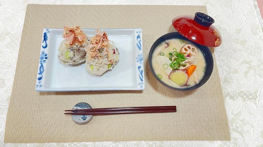 ・メニュー:出汁で作るさつまいもご飯 / 野菜たっぷり酒粕入りの豚汁