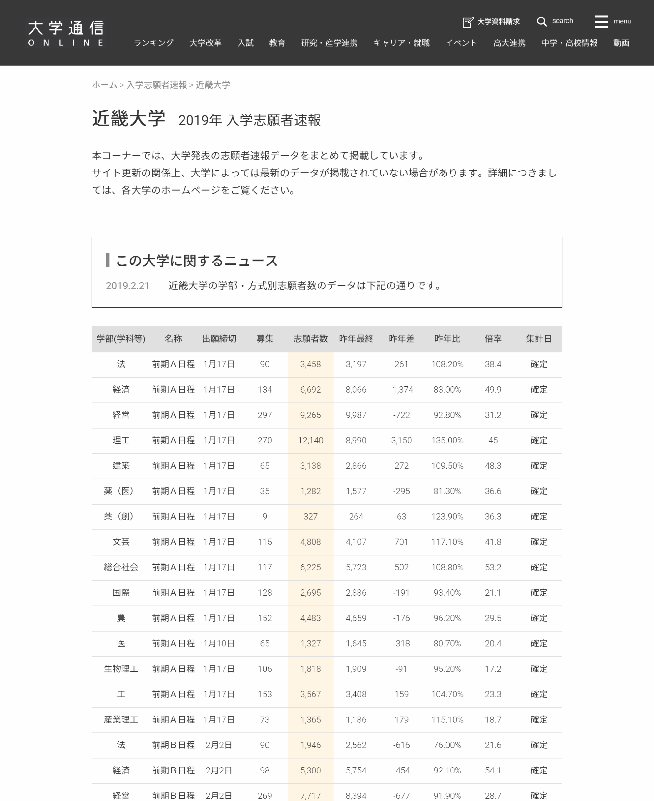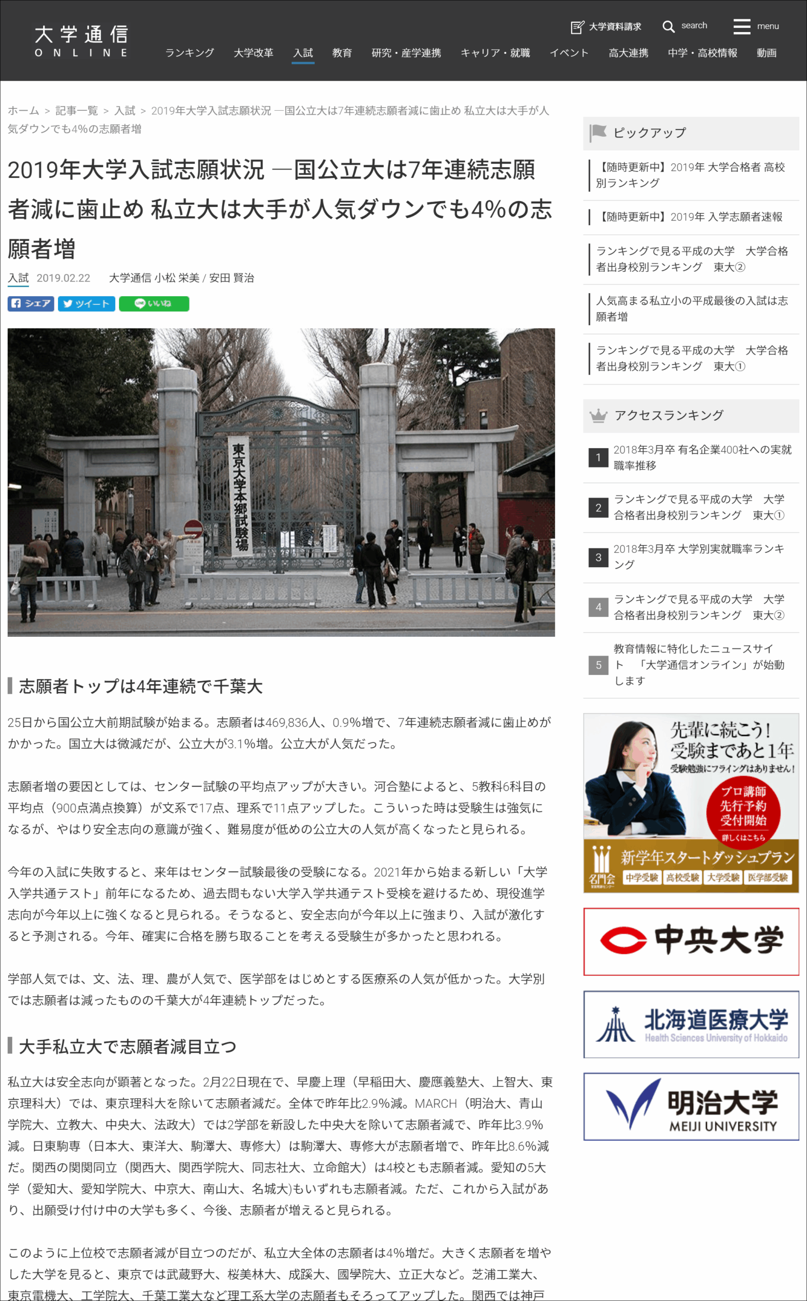 こうした中、2019年2月には弊社事業の代名詞ともいえる「出身高校別大学合格者数」をはじめ、貴重な受験・進学情報に特化したニュースサイト「大学通信オンライン」を公開。弊社ならではの精緻なエビデンスに基づく最新記事をどこよりも早く発信してまいります。