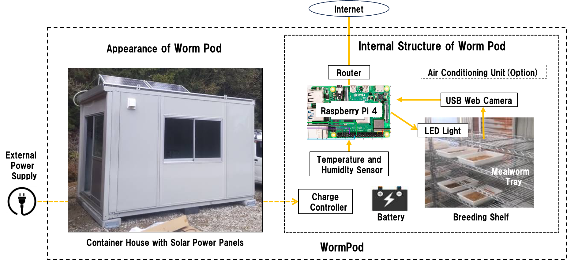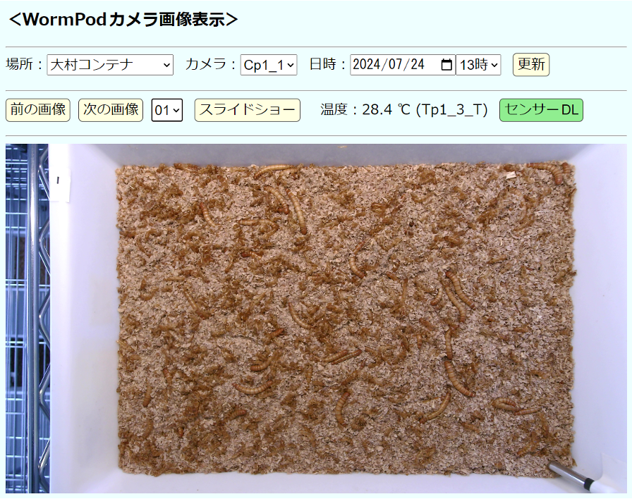 「Worm Pod」は、小型コンテナを活用した分散型のミルワーム育成装置です。各コンテナにはカメラや温湿度センサーが設置され、インターネットを通じてクラウドに接続されます(図2)。これにより、地理的に離れた複数のWorm Podを一つの”仮想的な大規模工場”としてまとめて管理することが可能になります。また、スマートフォンやパソコンから、いつでも育成状況を確認できます(図3)。