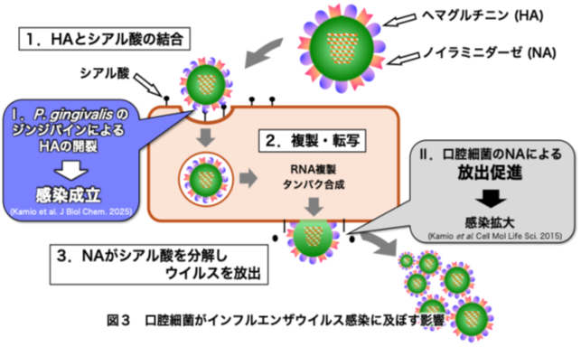 本研究チームによる今回と2015年の研究成果により、口腔細菌がインフルエンザウイルスの感染過程における「侵入」と「放出」という2つの重要なステップにおいて、以下の作用によりインフルエンザウイルス感染を促進している可能性があります(図3)。