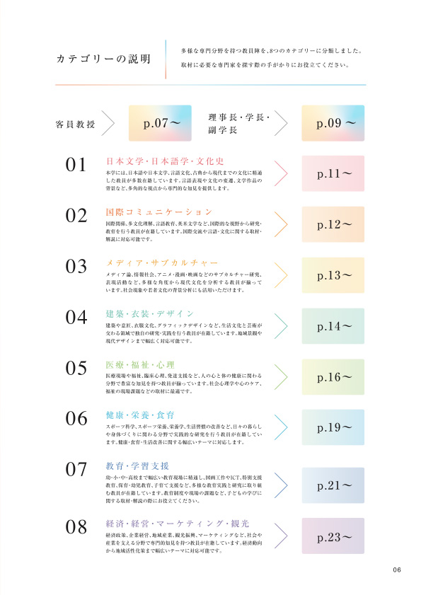 本ガイドブックは、報道現場における「限られた時間の中で信頼できる専門家を探す」という課題に応えることを目的とし、社会的関心の高いテーマを中心に教員65名を分野別に掲載したものです。教員ごとに「コメント」「専門分野」「主な実績」「著書情報」「研究者情報」を整理しました。さらに、すべての教員にQRコードを掲載し、web上に掲載されている研究者情報にもアクセスしやすい設計にしました。