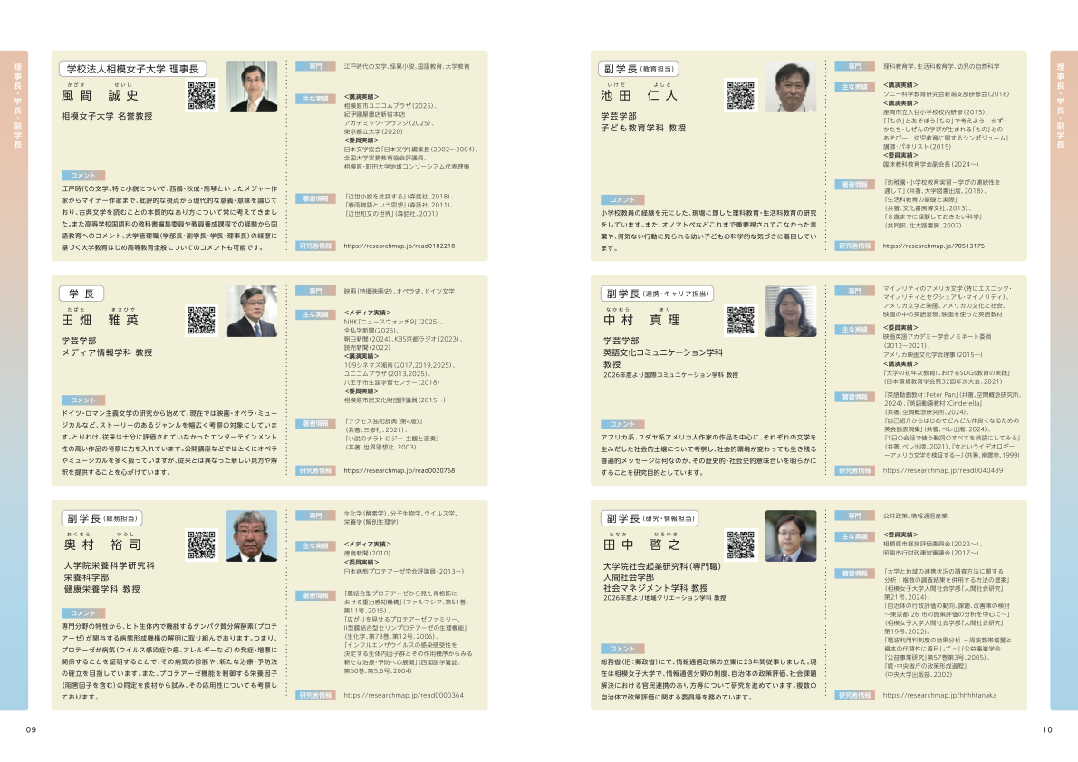 相模女子大学は2025年に創立125年を迎え、『日経グローカル』誌の「大学の地域貢献度ランキング」において10期連続全国女子大1位という評価をいただきました。研究や地域連携活動を通じて培ってきた実践知を、教育現場にとどめず、社会に還元することを重要な使命と考えています。ぜひ本冊子を活用いただけますと幸いです。