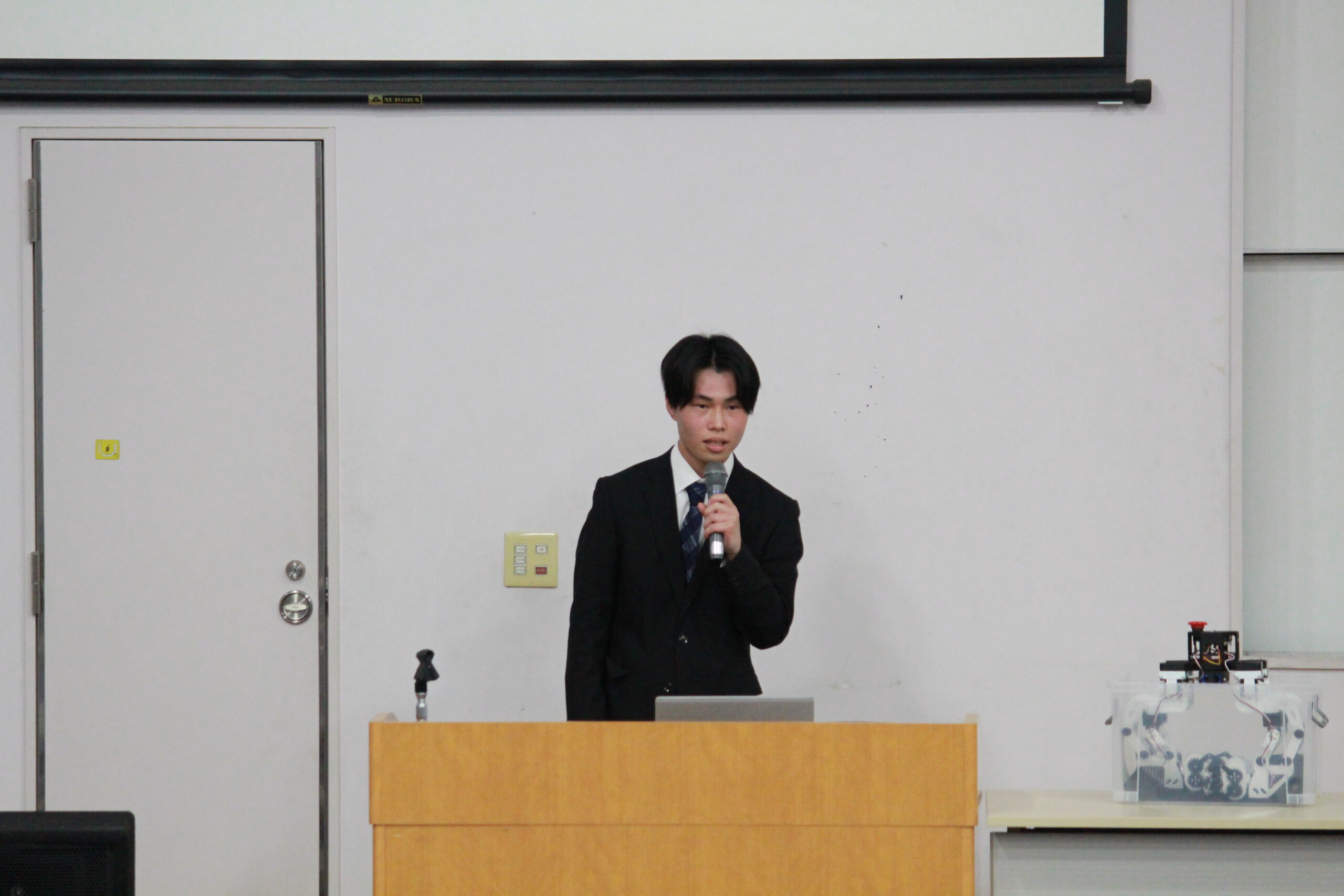 本学からは、建設学科4年生 高橋歩花さんと山﨑優月さんによる「『鴻巣アートの森』古民家改修プロジェクト」と、情報メカトロニクス学科4年生 松尾涼平さんによる「登攀メカニズムを持つクモ型多脚ロボットの開発」の計2件を発表しました。松尾さんは、ロボットの実演などを交え、優秀な発表を行ったとして、三大学長賞を受賞しました。