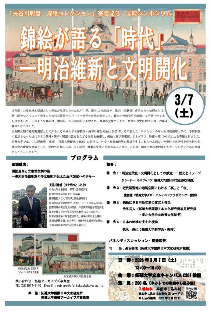 拓殖大学(東京都文京区・学長 鈴木昭一)は、2026年3月7日(土)、文京キャンパスにて国際シンポジウム「錦絵が語る『時代』―明治維新と文明開化」を開催します。文明開化期の錦絵蒐集家として知られる中央大学名誉教授・長谷川聰哲氏(拓殖大学貿易学科1971年卒業)より、2025年に錦絵(および石版画、和綴本等)200点以上の貴重なコレクションが拓殖大学へ寄贈されたことを記念したものです。
