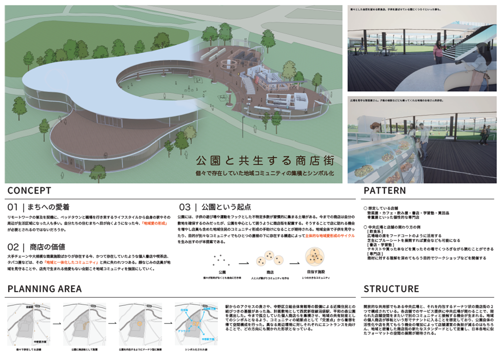 また、デザイン学科空間プロダクト領域3年生徳岡拓海さんによる作品「公園と共生する商店街 個々で存在していた地域コミュニティの集積とシンボル化」も入賞をはたしている。