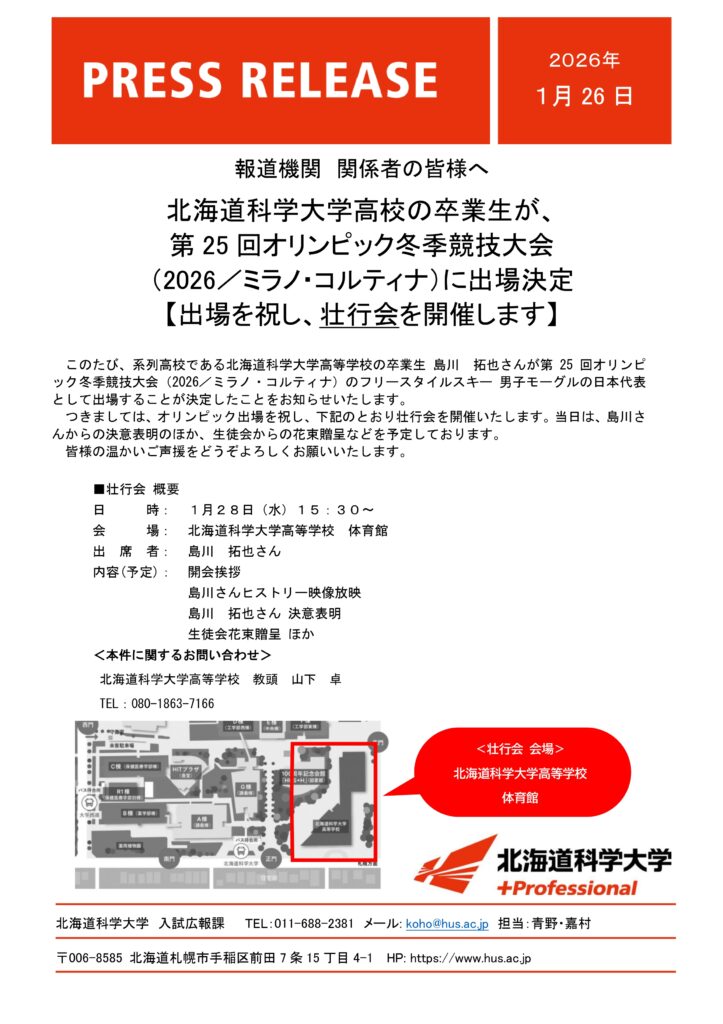 北海道科学大学高校の卒業生が、第25回オリンピック冬季競技大会(2026/ミラノ・コルティナ)に出場決定【出場を祝し、壮行会を開催します】