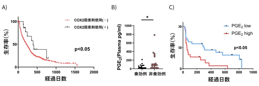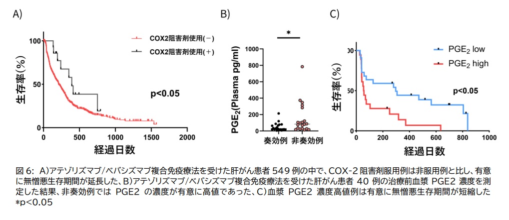 図6: A)アテゾリズマブ/ベバシズマブ複合免疫療法を受けた肝がん患者549例の中で、COX-2阻害剤服用例は非服用例と比し、有意に無憎悪生存期間が延長した。B)アテゾリズマブ/ベバシズマブ複合免疫療法を受けた肝がん患者40例の治療前血漿PGE₂濃度を測定した結果、非奏効例ではPGE₂の濃度が有意に高値であった、C)血漿 PGE₂濃度高値例は有意に無憎悪生存期間が短縮した。  *p<0.05