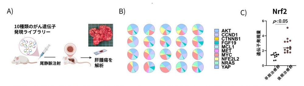 図2: A)10種類のがん遺伝子を尾静脈より急速静注し肝腫瘍を形成。B)各腫瘍内のがん遺伝子の頻度分布は腫瘍毎に異なり、腫瘍間不均一性が認められる。C)複合免疫療法抵抗性腫瘍では NRF2 遺伝子発現が上昇
