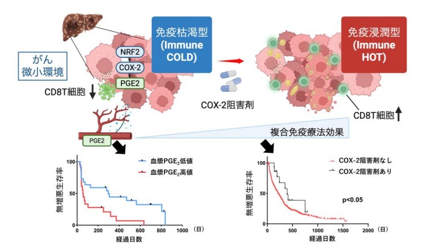 NRF2-COX-PGE₂経路活性化により免疫細胞が腫瘍内に少ない「免疫枯渇型」腫瘍が形成され、複合免疫療法に抵抗性を示す。血漿PGE₂濃度により複合免疫療法の効果が予測されCOX-2阻害剤が複合免疫療法に対する抵抗性解除につながる可能性がある。