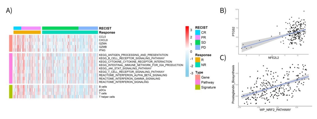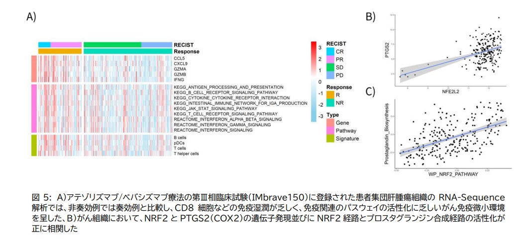 図5: A)アテゾリズマブ/ベバシズマブ療法の第Ⅲ相臨床試験(IMbrave150)に登録された患者集団肝腫瘍組織のRNA-Sequence解析では、非奏効例では奏効例と比較し、CD8細胞などの免疫湿潤が乏しく、免疫関連のパスウェイの活性化に乏しいがん免疫微小環境を呈した。B)がん組織において、NRF2とPTGS2(COX2)の遺伝子発現ならびにNRF2経路とプロスタグランジン合成経路の活性化が正に相関した。
