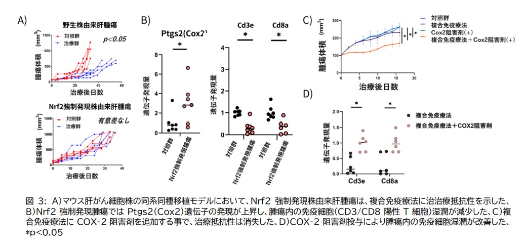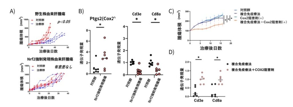 図3: A)マウス肝がん細胞株の同系同種移植モデルにおいて、Nrf2 強制発現株由来肝腫瘍は、複合免疫療法に治治療抵抗性を示した。B)Nrf2 強制発現腫瘍では Ptgs2(Cox2)遺伝子の発現が上昇し、腫瘍内の免疫細胞(CD3/CD8 陽性 T 細胞)湿潤が減少した。C)複合免疫療法に COX-2 阻害剤を追加することで、治療抵抗性は消失した、D)COX-2 阻害剤投与により腫瘍内の免疫細胞湿潤が改善した。  *p<0.05