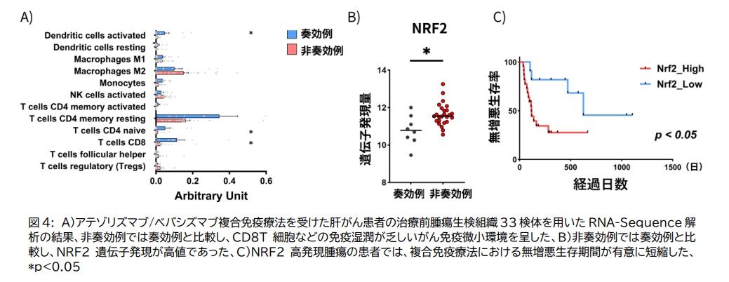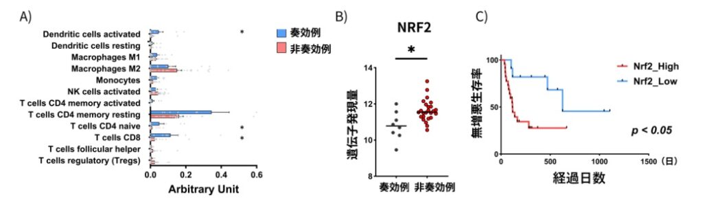 図4: A)アテゾリズマブ/ベバシズマブ複合免疫療法を受けた肝がん患者の治療前腫瘍生検組織33検体を用いたRNA-Sequence解析の結果、非奏効例では奏効例と比較し、CD8T細胞などの免疫湿潤が乏しいがん免疫微小環境を呈した。B)非奏効例では奏効例と比較し、NRF2遺伝子発現が高値であった。C)NRF2高発現腫瘍の患者では、複合免疫療法における無増悪生存期間が有意に短縮した。  *p<0.05