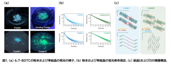 ・外部刺激による粉末試料の発光色の変化、励起子の非局在化/局在化の機構を、結晶多形のX線結晶構造解析と蛍光寿命測定により分子レベルで実証