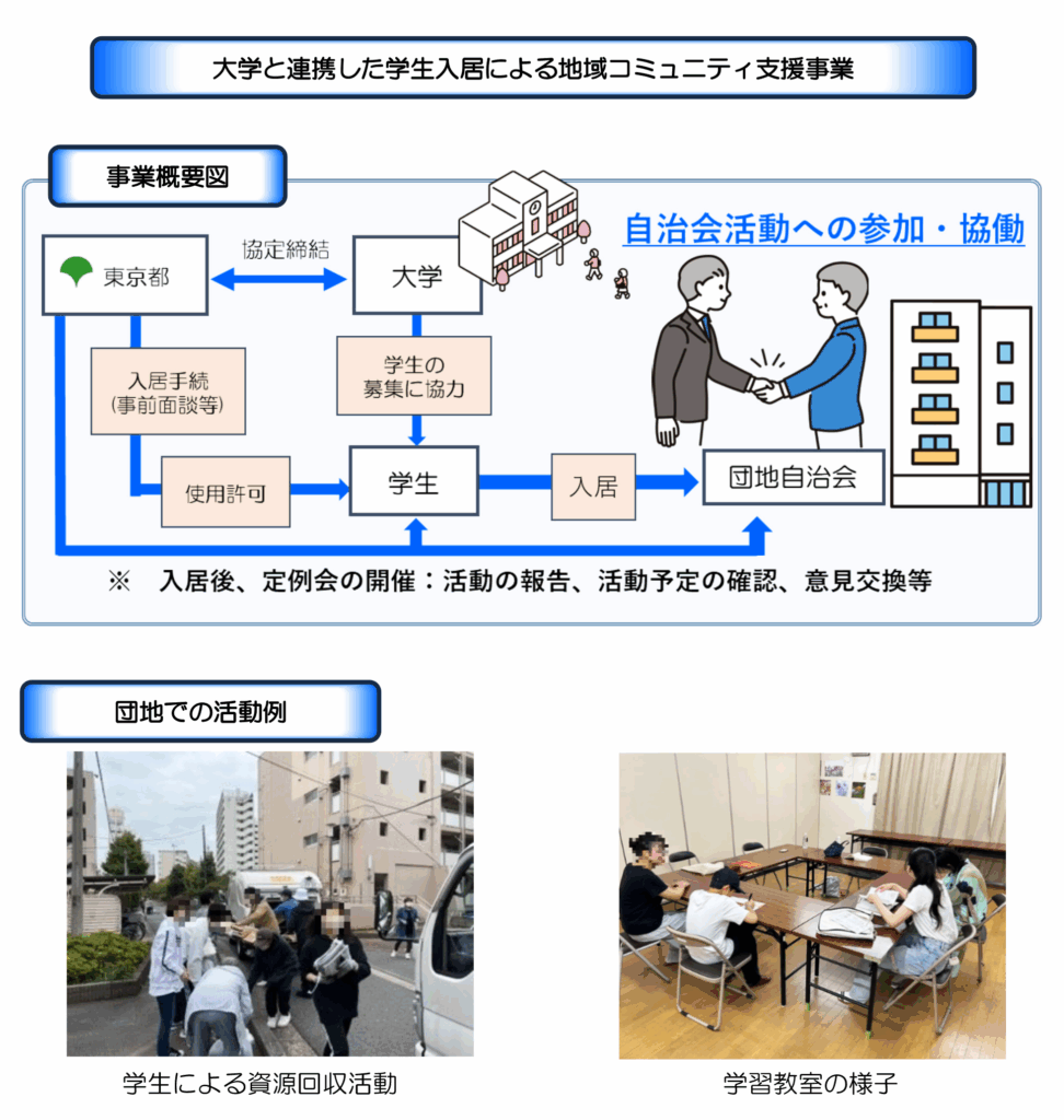 東京都では令和4年から、都内の大学と連携し、在籍している学生が都営住宅に居住し自治会活動に協力するなど、団地や地域のコミュニティ活動を支援する取り組みを実施している(事業の概要等は画像「別紙」を参照)。