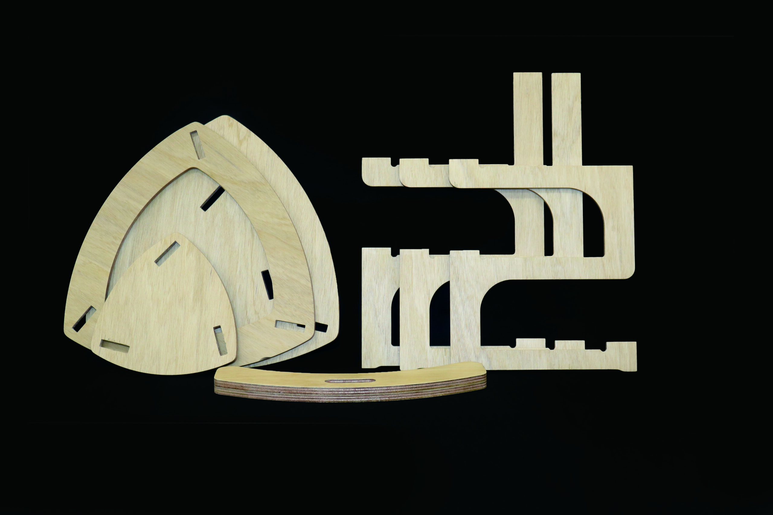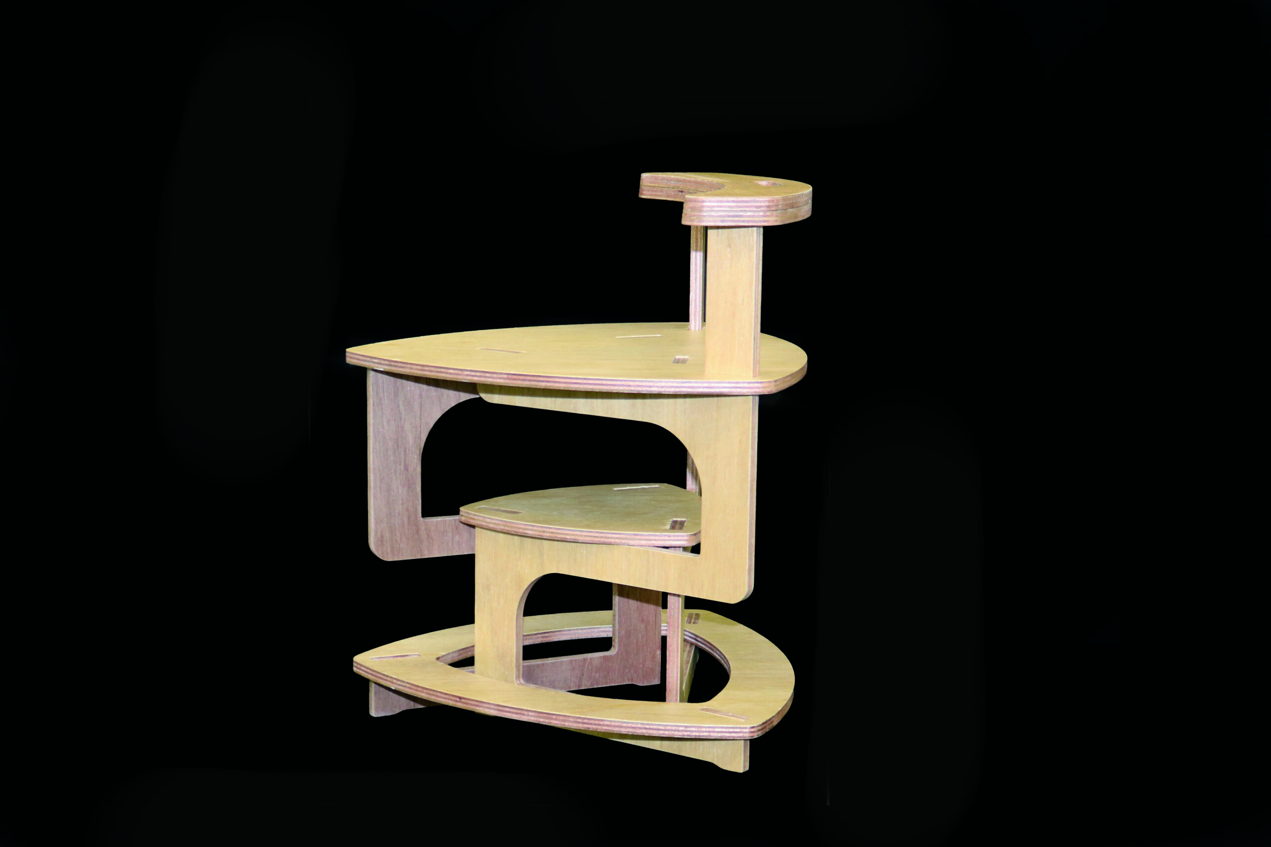 3つのカンチレバー構造を使用し、立体感のある構造と合板の特徴のしなる動きを全身の 圧力を分散させる構造に活かしました。2段目の面には物を置いたりして使用することができます。そして背もたれには合板の厚みを増やし、斜めに加工することによって、よい座り心地にしています。斜めに座ったり、横向きに座ったりして、背もたれをひじ掛けとして使用することもできます。組み立て式の構造にしており、組み外すと、とてもコンパ クトで収納がしやすいのも特徴です。