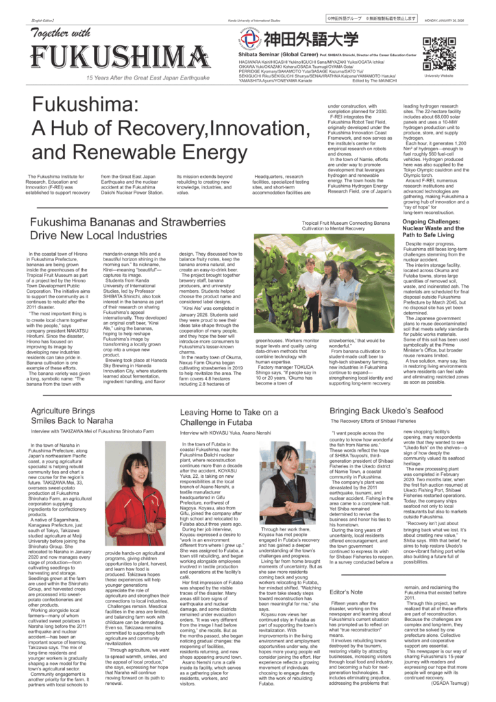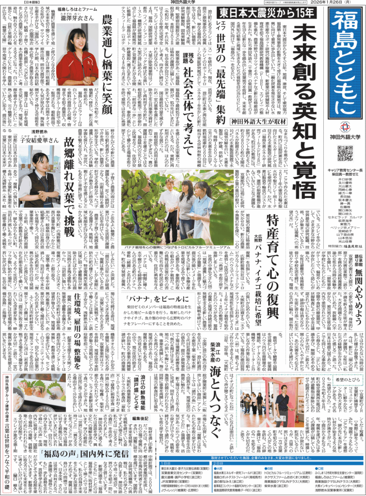 その一環として実施しているのが、学生主体による「震災復興発信プロジェクト」です。中心を担うのは、グローバル人材の育成を目指す神田外語大学・柴田真一ゼミの学生19名で、2025年8月には福島県浜通り地域を訪問。震災復興や新産業、特産品、地域振興など、「福島の過去・現在・未来」を自らの目で取材し、その経験と学びをもとに日英版の震災復興新聞『福島とともに(英題”Together with Fukushima”)』を完成させました。