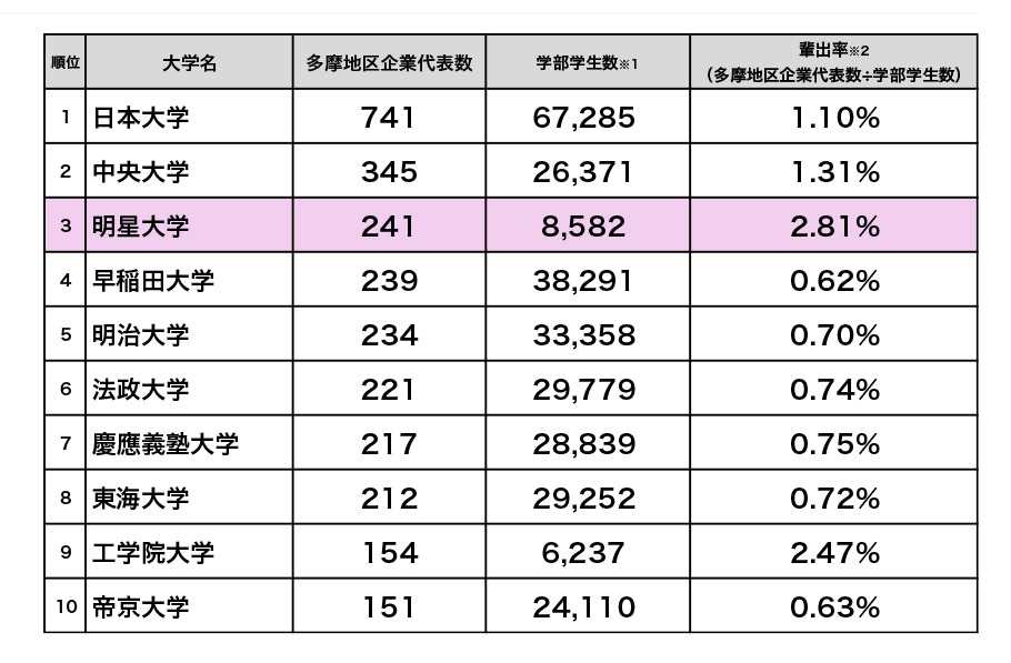 「多摩地区企業代表 出身大学別ランキング」で明星大学が3位に― 多摩に根ざした企業経営者を多数輩出、「代表輩出率」ではトップに