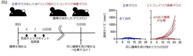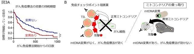 研究チームは、TILのミトコンドリアの損傷原因を解明するために、mtDNAの配列を調べたところ、約40%の症例でがん細胞と同じ変異が見つかりました(図1A)。そこで、がん細胞からTILへのミトコンドリアの移動を疑い、がん細胞のミトコンドリアを赤、TILのミトコンドリアを緑に色付けして観察したところ、がん細胞からTILにミトコンドリアが移動し、入れ替わるものがあることがわかりました(図1B)。その結果、がん細胞のmtDNA変異がTILにも現れるようになりました。その原因として、活性酸素(ROS)が関与していると考え、ROSを取り除く薬を使うと、ミトコンドリアの入れ替わりが抑えられました。また、変異したTILではエネルギーを作る機能が低下し、その働きも弱くなりました。T細胞のミトコンドリアが損傷したマウスでは、がん免疫療法が効きにくくなり、特にいったん免疫チェックポイント阻害薬で治療した後に、腫瘍が再びできやすくなることが示されました(図2)。さらに、腫瘍でmtDNA変異が見つかる患者さんでは、がん免疫療法の効果が長続きせず、生存率も悪化することがわかりました(図3A)。これらの結果から、がん細胞が異常なミトコンドリアをTILに送り込み乗っ取ってしまうことでTILの働きを妨げ、免疫システムから逃れようとしていることが明らかになり、このことががん免疫療法の効果を弱める一因となっていることがわかりました(図3B)。