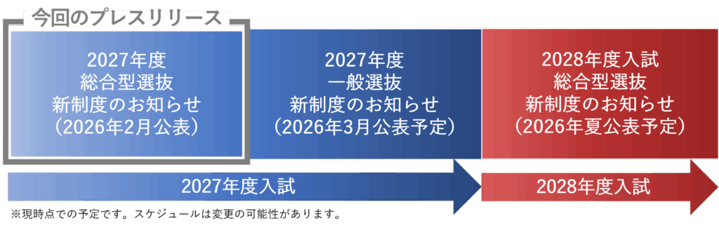 東京女子大学は、2027年度および2028年度にわたり、従来の入学試験制度に加え、新たな選抜方式の追加を予定しております。公表スケジュールは以下の通りです。随時大学公式サイト等でお知らせします。