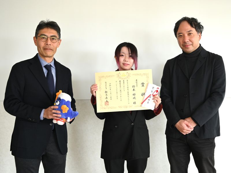 デザインは県内学生など全体で105点の応募があり、その中から採用されました。表彰式が本学静岡瀬名キャンパスで行われ、賞状と賞金・記念品が鈴木那琉さんに贈られました。