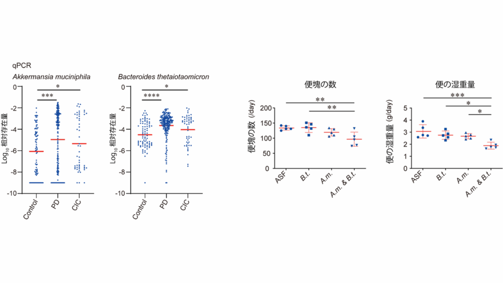 - 2種類の細菌による「協奏関係」を証明(原因の特定): 患者のデータだけでは、細菌の増加が便秘の「原因」なのか、便秘になった「結果」なのかは不明でした。そこで研究チームは、無菌マウスにこれらの細菌を移植する実験を行いました。その結果、どちらか一方の菌だけを定着させても便秘にはなりませんでした。しかし、2種類の菌を同時に定着させると、マウスは便秘(便が硬くなり、回数が減る)を発症しました(図2; ASF: 定着する細菌の種類を限定したノトバイオートマウス、B.t.: バクテロイデス・シータイオタオミクロンノトバイオートマウス、A.m.: アッカーマンシア・ムシニフィラ ノトバイオートマウス)。