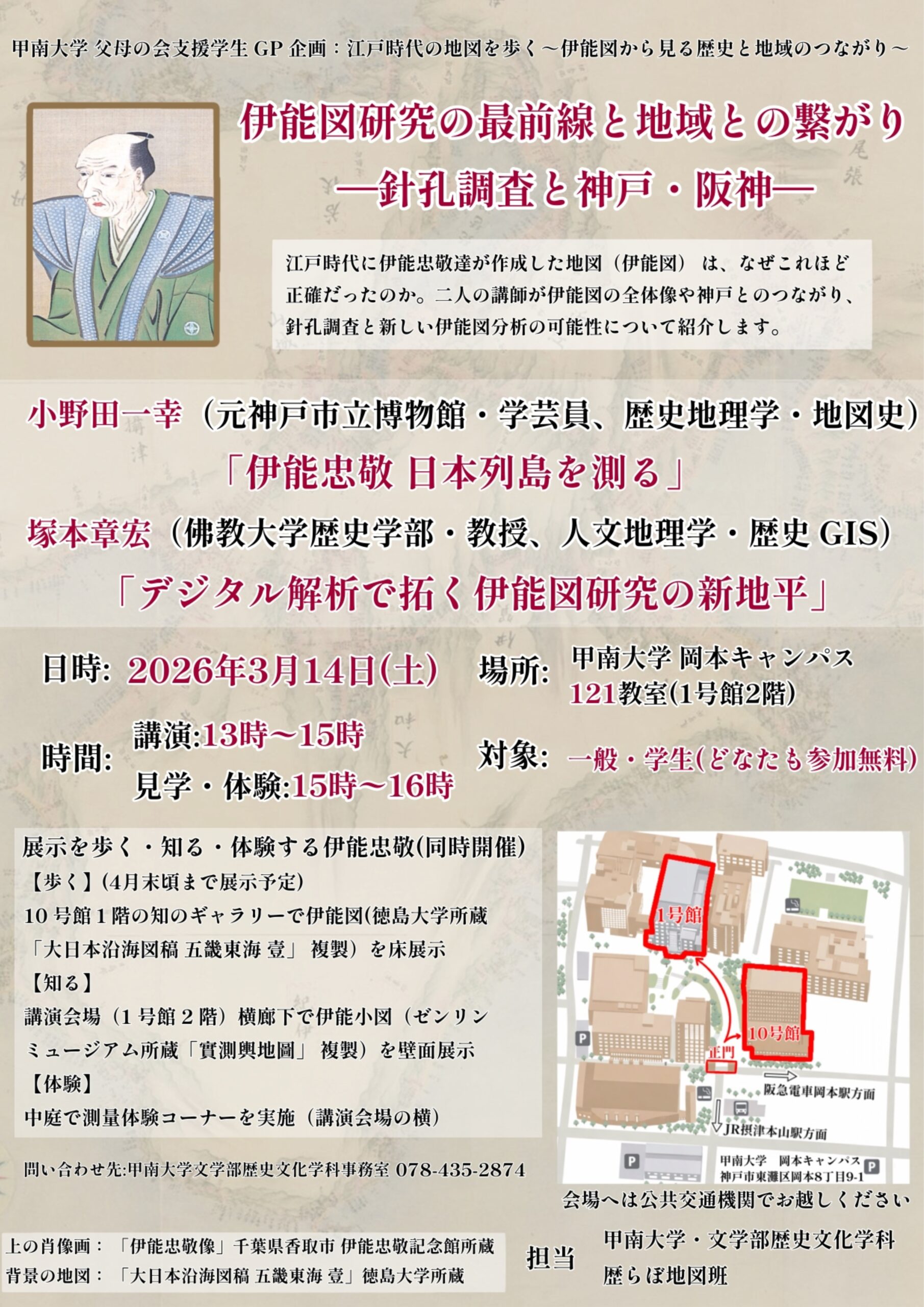 甲南大学文学部歴史文化学科の教員と学生から構成される「歴らぼ地図班」は、古地図研究の第一人者で、伊能図を研究する方々を講師に招いた講演会「伊能図研究の最前線と地域との繋がり ―針孔調査と神戸・阪神―」を、3月14日(土)に甲南大学岡本キャンパスで開催いたします。さらに講演会後、「展示を歩く・知る・体験する伊能忠敬」と題し、測量体験等の体験イベントも開催いたします(講演会、体験イベントともに参加申し込みは不要)。