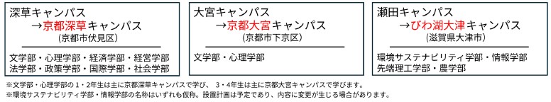 | 深草キャンパス →京都深草キャンパス (京都市伏見区) | 大宮キャンパス →京都大宮キャンパス (京都市下京区) | 瀬田キャンパス →びわ湖大津キャンパス (滋賀県大津市) |