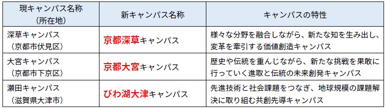 ・2027年4月には、キャンパスコンセプトにあわせて3つのキャンパス名称を「京都深草キャンパス」、「京都大宮キャンパス」、「びわ湖大津キャンパス」に変更し、多様な人が集う場を目指す。