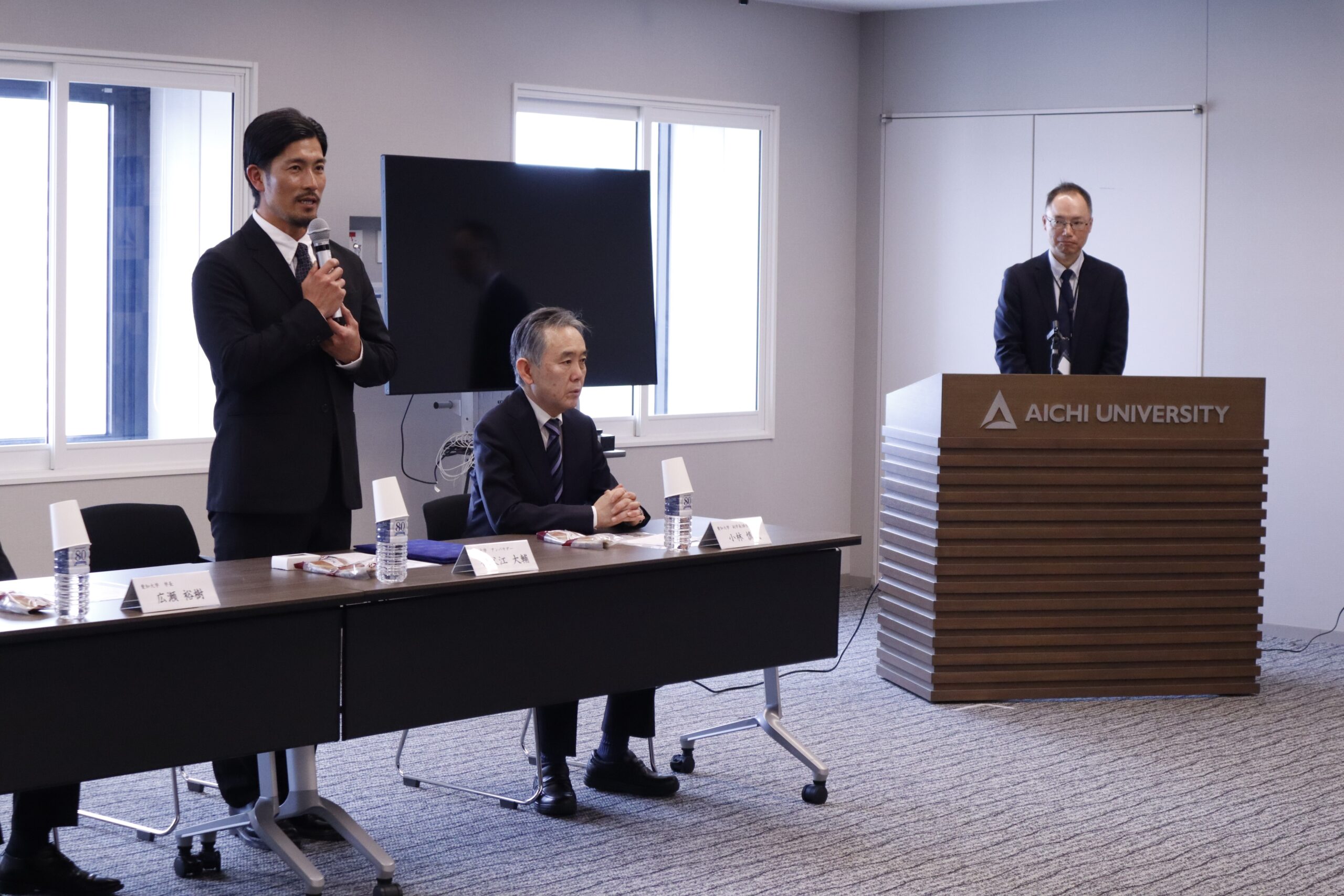 就任式で祖父江氏からは、「野球選手として成長することができた大好きな愛知大学に、アンバサダーとして関われることを大変喜んでいます。野球人生で得た学びや考え方を学生に伝え、挑戦する気持ちを後押ししたい。そして、母校や地元に貢献していきたいです。」と抱負が述べられました。広瀬学長からは、「祖父江さんがプロ野球で見せてくれた雄姿は非常に頼もしく、在学生にとっても励みになっていました。これまでの経験を学生に伝えていただき、成長するきっかけになってほしい。」と期待が述べられました。