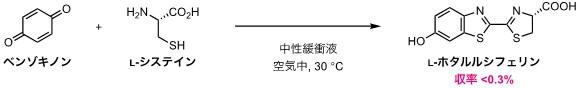 この反応で使われているルシフェラーゼタンパク質は、遺伝子組換え大腸菌を使った大量生産法が確立されています。その一方で、ホタルが体内でどのようにしてルシフェリンを合成しているか(生合成)は、ルシフェリンの構造決定(1964年)以来、多くの研究がなされてきたにも関わらず、ほとんど未解明です。本研究グループは2016年に、このホタルルシフェリンの生合成の研究過程で、その原料として知られているL-システインとベンゾキノンを中性緩衝液中で撹拌すると、わずか(収率約0.3%)ながらL-ルシフェリンが生成することを偶然発見し、報告しました(図2)。