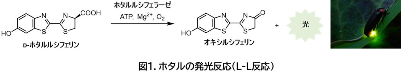 ホタルの生物発光は、身近にみられる幻想的な生命現象としてよく知られていますが、その光は発光物質D-ホタルルシフェリンと酵素ルシフェラーゼによる酸化反応によって発生するもので、ルシフェリンールシフェラーゼ反応(L-L反応)と呼ばれています(図1)。この発光反応には酸素とマグネシウムイオン、ATP(注3)が必要であるため、それを利用したATPの高感度測定が開発されています。これは病原菌などの簡便・迅速な検出法(ATPふき取り検査)として、食品工場や医療現場での衛生検査に用いられるなど、公衆衛生上重要な役割を担っています。また、組換え遺伝子の発現をモニターするレポーターアッセイ(注4)や、ライブイメージングにも使われるなど、生命科学分野の実験で欠かすことのできない技術としても知られています。