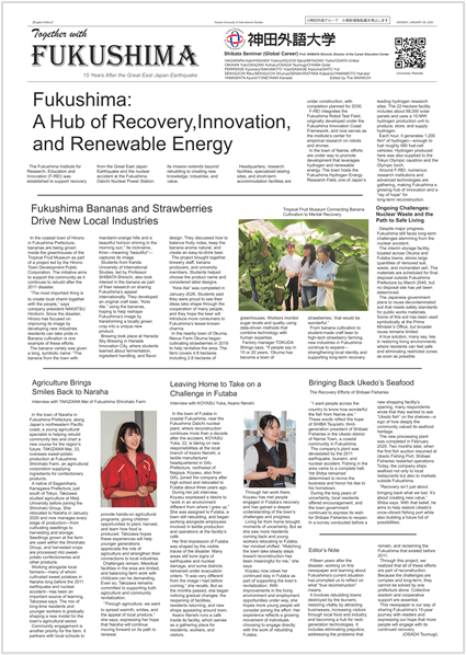 本紙は、国際系の大学である「神田外語大学の学生だからこそできること」をテーマに、行政や企業の取り組みだけではなく、福島で活動する人々の声や思いを大切に、福島の「今」を多面的に世界に伝えることを目的に制作されました。