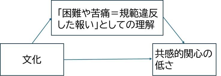 ・日本人の共感的関心の低さの背景に、苦しみをその人間の社会規範や秩序からの逸脱による報いとして解釈する傾向があることを示した。
